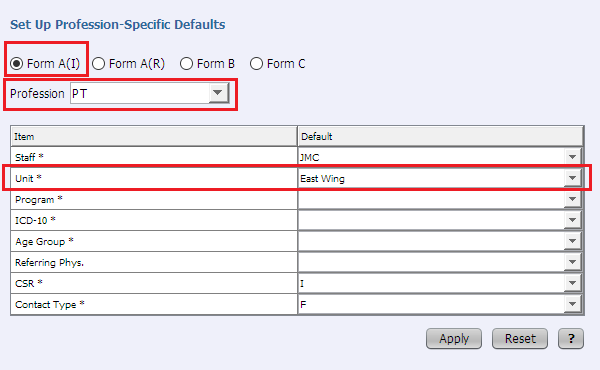 It is possible to configure a default unit, amongst other codes, that will get selected by default when a user loads one of the main data entry forms and selects a particular profession. This is done per user using the User Preferences page.